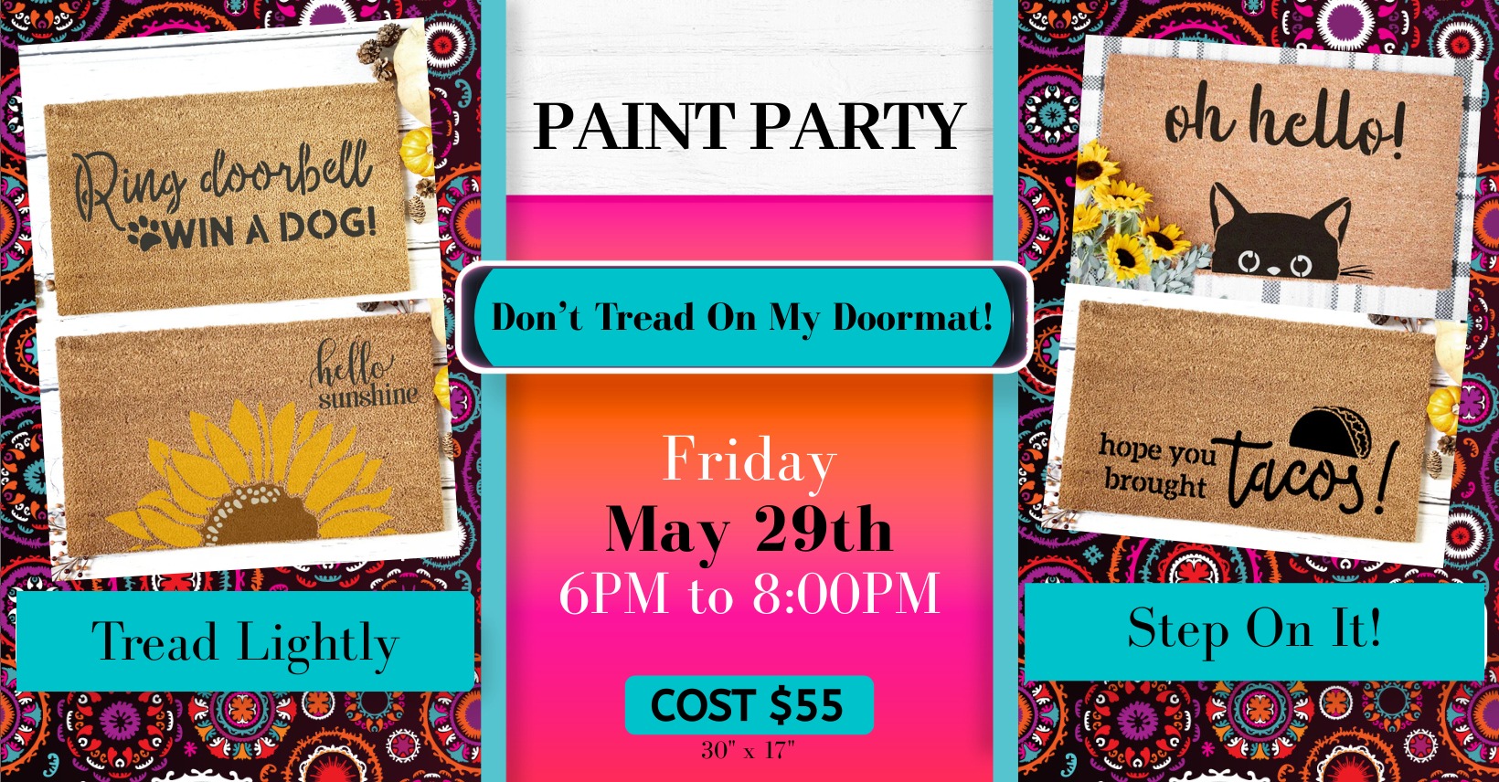 Join us for our Don’t Tread on My Doormat party where you’ll design and paint your very own custom doormat—perfect for adding a fun (or slightly sassy 😉) touch to your front porch! Choose from a variety of designs and I’ll guide you step-by-step, so no experience is needed.